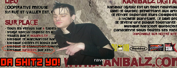 - www.kanibalz.com - Kanibalz / War BeatsRichardcore - Flames, Sensitive Triky - www.triky.ca - Flames , Mystik Mister Fly - www.kanibalz.com www.myspace.com - Kanibalz Supernova - www.kanibalz.com - Kanibalz Merkurius - www.djmerkurius.com - Kanibalz Sicatrix (Canada, Ontario, Ottawa) - www.ottawaraves.com - 1upped Productions DJ Delirium (USA, New Jersey, Newark) - www.djdelirium.com - Traxtorm, Megarave, H2oh, MOH DJ Mad Dog (Italy, Roma) - www.djmaddog.com - Traxtorm Records Miz - www.kanibalz.com - Kanibalz IZNOGOOD (Canada, Quebec, Montreal) - www.discphunktionnalrecords.com - Discphunktionnal records Sickness (Canada, Quebec, Verdun) (Terrorcore) - soundcloud.com - Destitution Records, TMS Stokiométrak - www.kanibalz.com - Kanibalz, FLB maarks.tv (Canada, Quebec, Montreal) - www.maarksco.net - maarksco.net // musicnfriends.c |