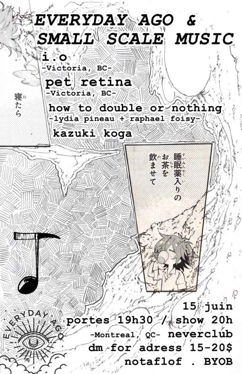 | Linked To Flyers: | EVERYDAY AGO-SMALL SCALE MUSIC: I.o, Pet Retina, Kazuki Koga, How To Double Or Nothing, |