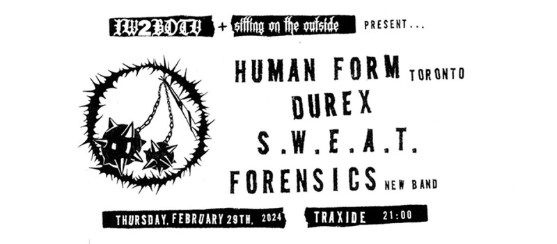 | Linked To Flyers: | LEAP YEAR SHOW : HUMAN FORM (TO) DUREX S.W.E.A.T. FORENSICS (FIRST SHOW) |