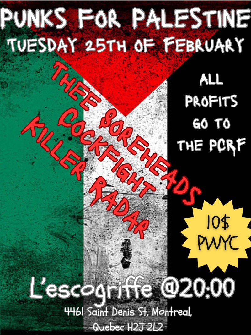 | Linked To Flyers: | Punks For Palestine. A PCRF Fundraiser. Thee Soreheads Cockfight Killeradar. |