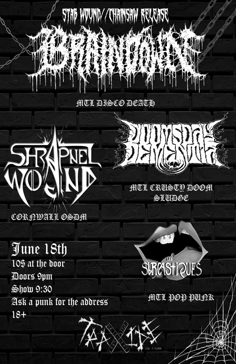 | Linked To Flyers: | STAB WOUND,, CHAINSAW RELEASE SHOW BRAINDOWN, SHRAPNEL WOUND, DOMMSDAY DEMENTIA, LES SARCASTIQUES Th |