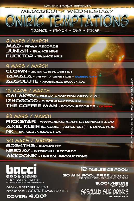 | Linked To Flyers: | Oniric (Psy) Temptations, Oniric (Psy) Temptations, Oniric (Trance) Temptations, Oniric Temptations, Oniric Temptations, Oniric Trance Temptations |